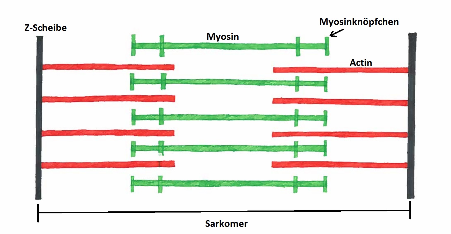 -das dicke Myosinfilament das Golfschläger ähnliche Kopfteile hat und eine Bindungsstelle für das ATP besitzt -dazwischen ragen die dünnen Aktinfilamente die sich aber nicht berühren -die Titinfilamente durchziehen das gesamte Sarkomer und dienen als elastische Federn zwischen den Z-Streifen um dann steif bis zur Sarkomer Mitte zu. Sie sind also so etwas wie die Heizung von deinem. Dabei werden die Aktinfilamente in der rechten und linken Sarkomerhälfte zur Mitte gezogen.